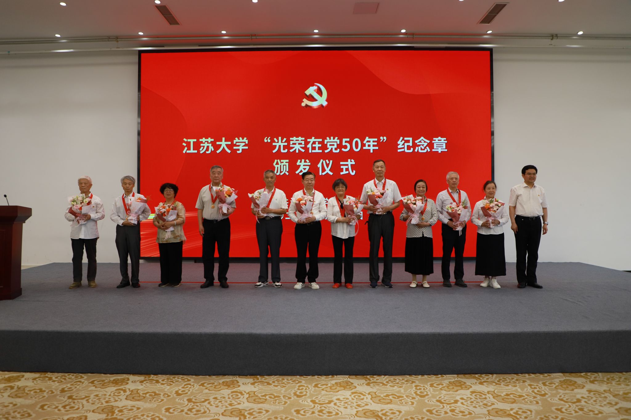 在庆祝中国共产党成立104周年之际,为表彰先进、致敬荣光,6月20日,“七一”表彰大会暨“光荣在党50年”纪念章颁发仪式在青教公寓三江厅举行。校党委书记李洪波,校党委副书记张济建,校党委常委、纪委书记、派驻监察专员杜永春,校党委常委、组织部部长杨敬江,校党委常委、宣传部部长、统战部部长吴麟麟出席大会。大会由张济建主持。