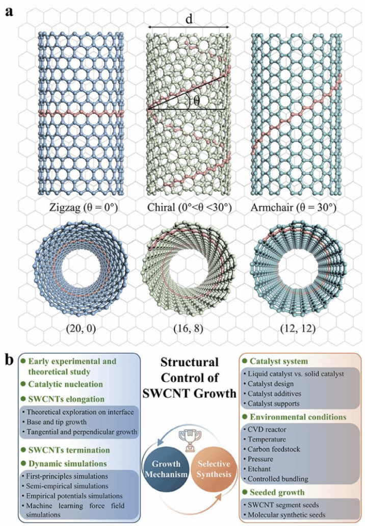 该综述从理论与实验紧密结合、相互促进的角度出发,全面梳理了近35年来SWCNT的生长机制及其选择性合成的历史脉络和最新理论实验进展,主要内容包括SWCNT的生长机制、SWCNT生长分子模拟、基于催化剂设计的SWCNT选择性生长、生长环境对SWCNT选择性生长的影响以及碳纳米管克隆生长。综述提出了SWCNT选择性可控生长面临的主要挑战以及最终可行的解决方案,为未来10年SWCNT生长研究提供了方向。