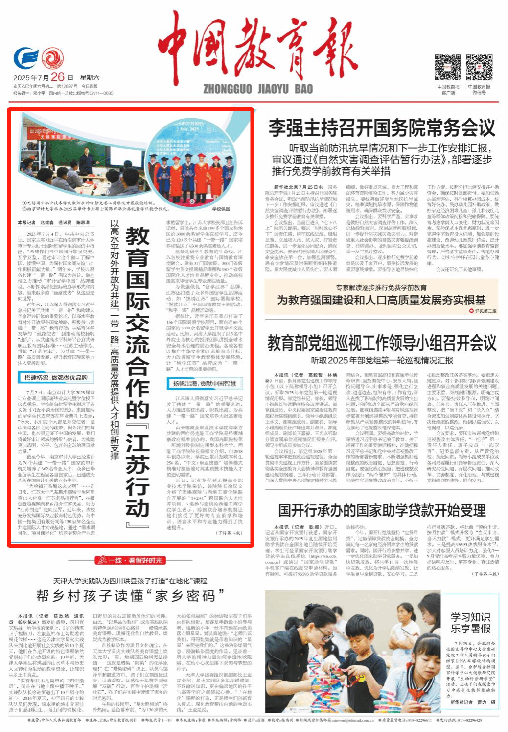 7月26日,《光明日报》与《中国教育报》头版分别报道学校育人成效,展现了学校人才培养深度融入国家战略与产业发展的生动实践。