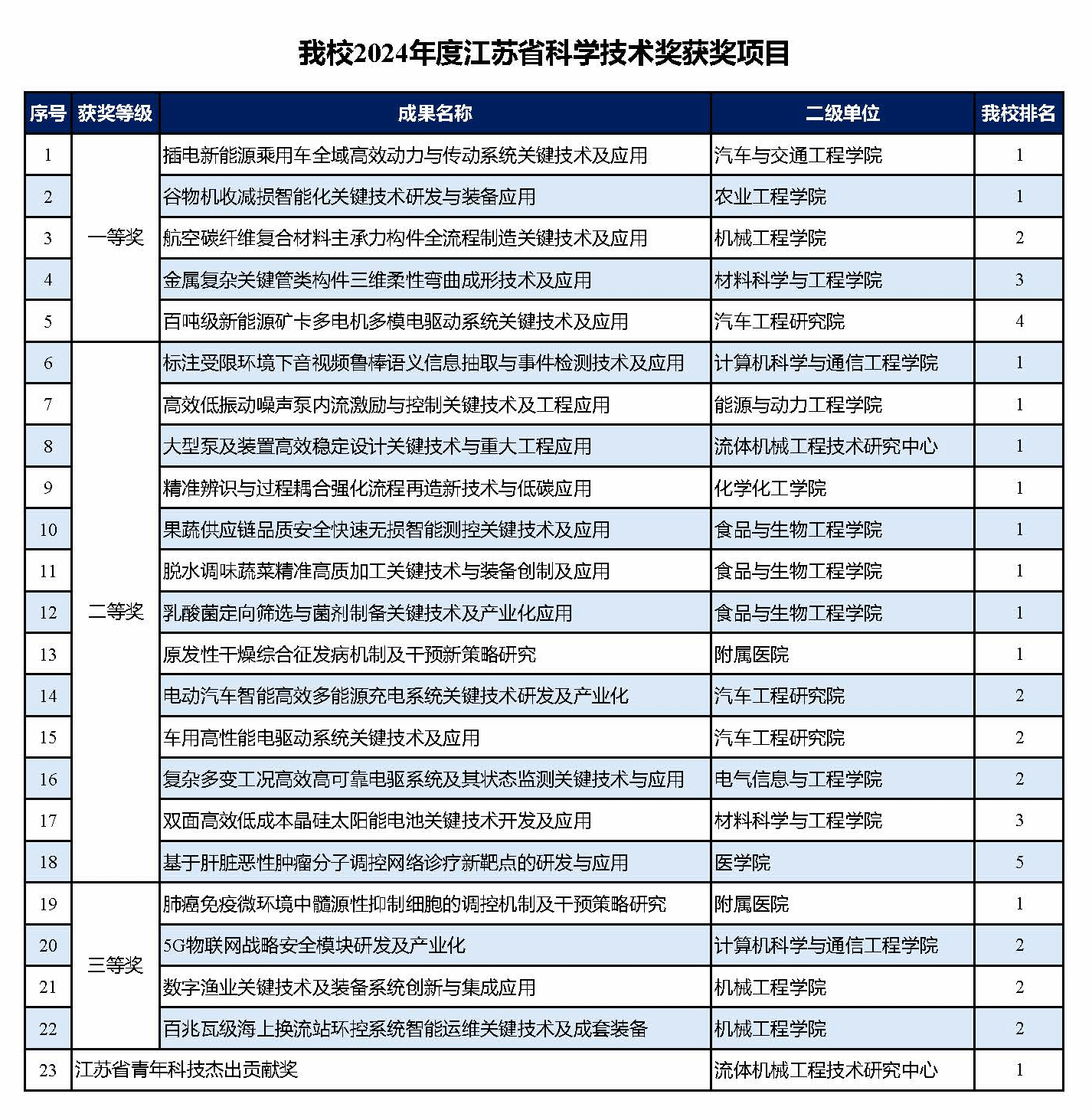 1月23日,江苏省政府网站发布了《省政府关于2024年度江苏省科学技术奖励的决定》,我校获奖23项,获奖数量创历史新高,包括一等奖5项、二等奖13项、三等奖4项,并首次实现“江苏省青年科技杰出贡献奖”突破,获奖总数和质量实现双提升。