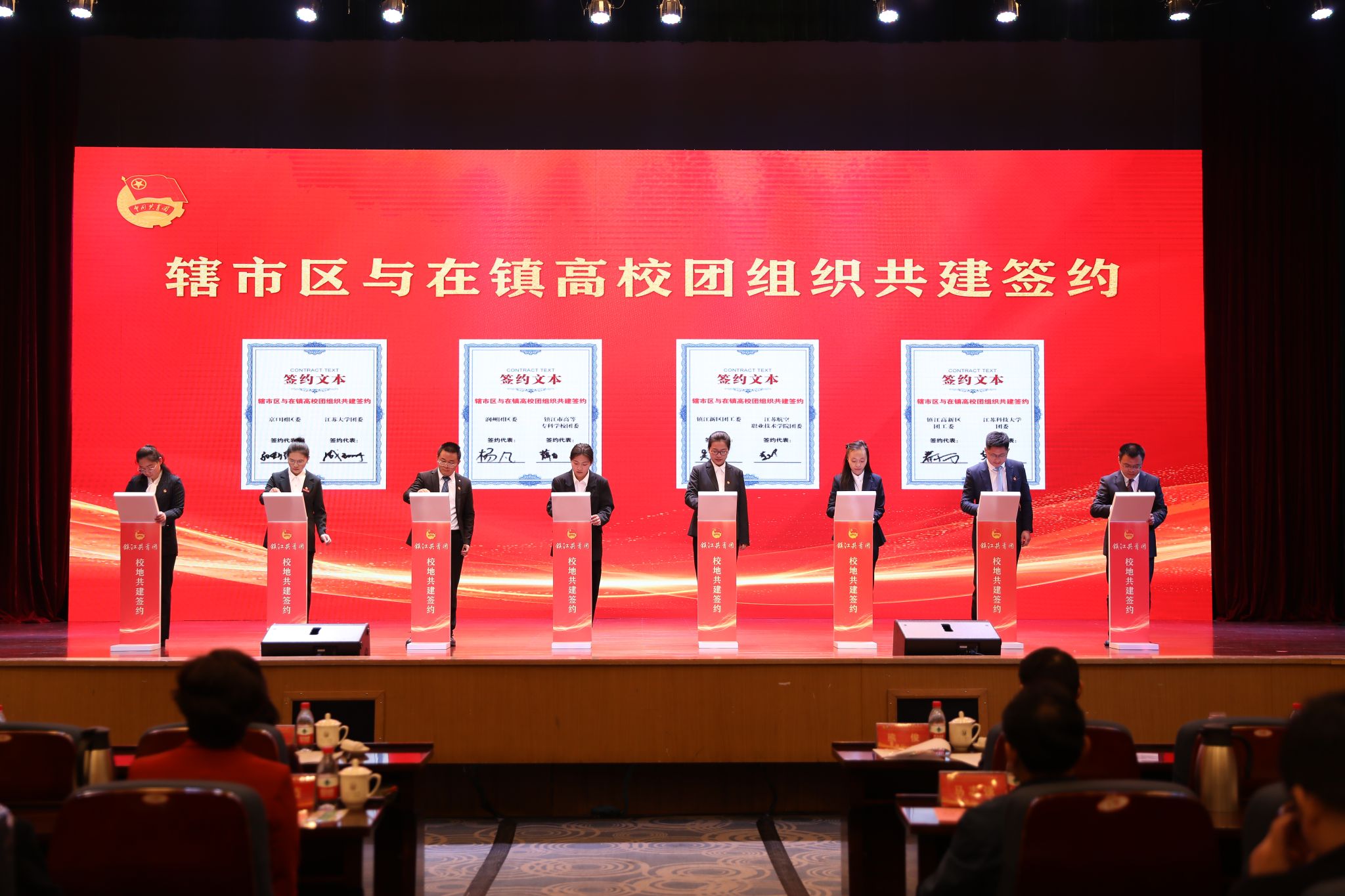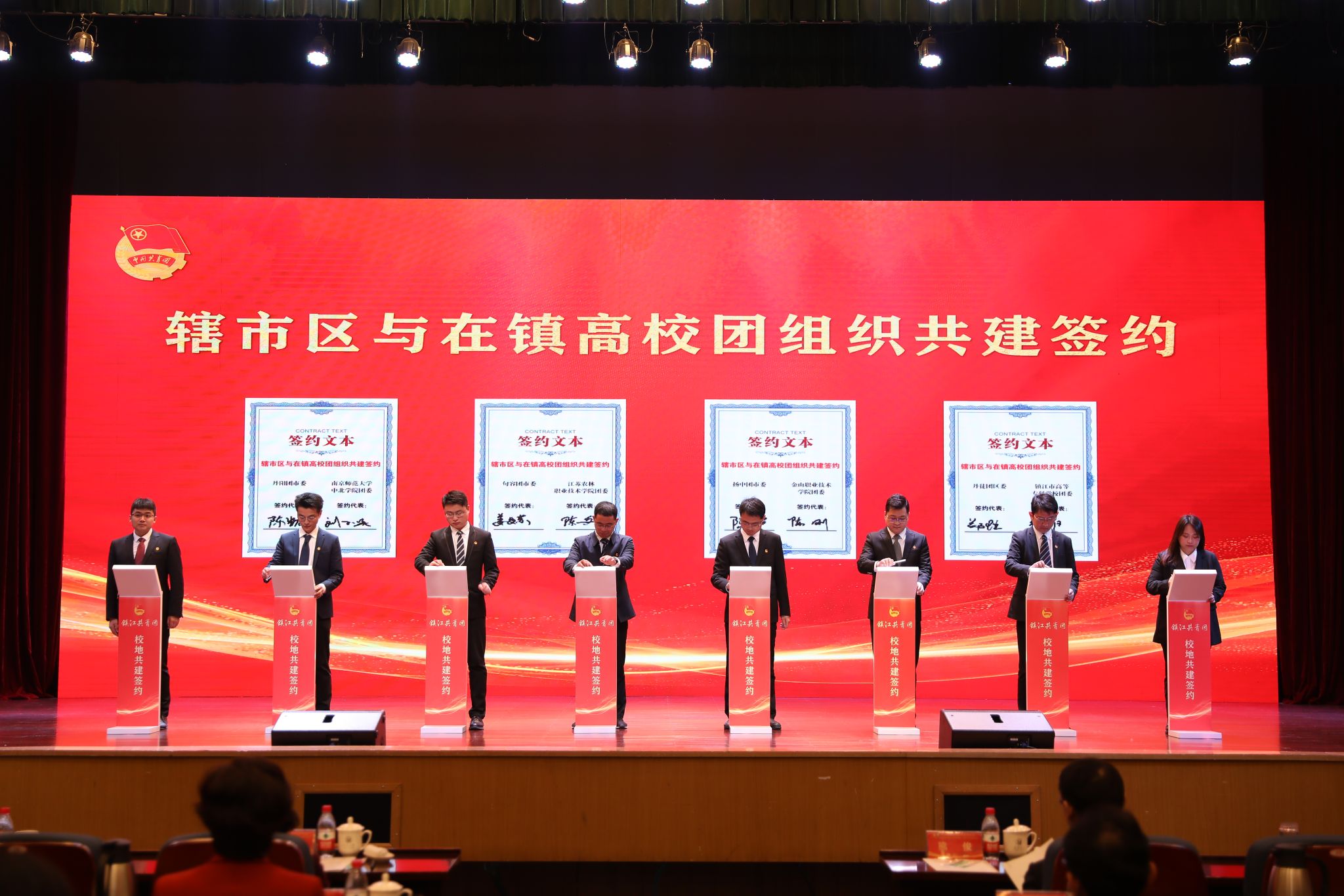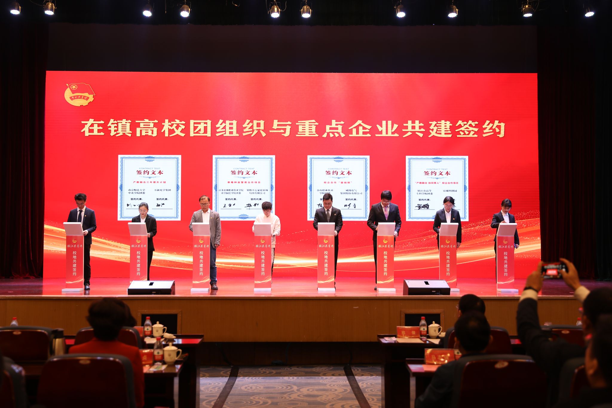 仪式上,在镇高校与各辖市区团组织和重点企业进行了共建合作签约。金年会jinnianhuicom、江苏科技大学等在镇高校,分别与团京口区委、镇江高新区团工委等辖市区团组织结对共建。江苏农林职业技术学院农学园艺学院、江苏航空职业技术学院团委等高校团组织分别与有关企业签订合作项目。