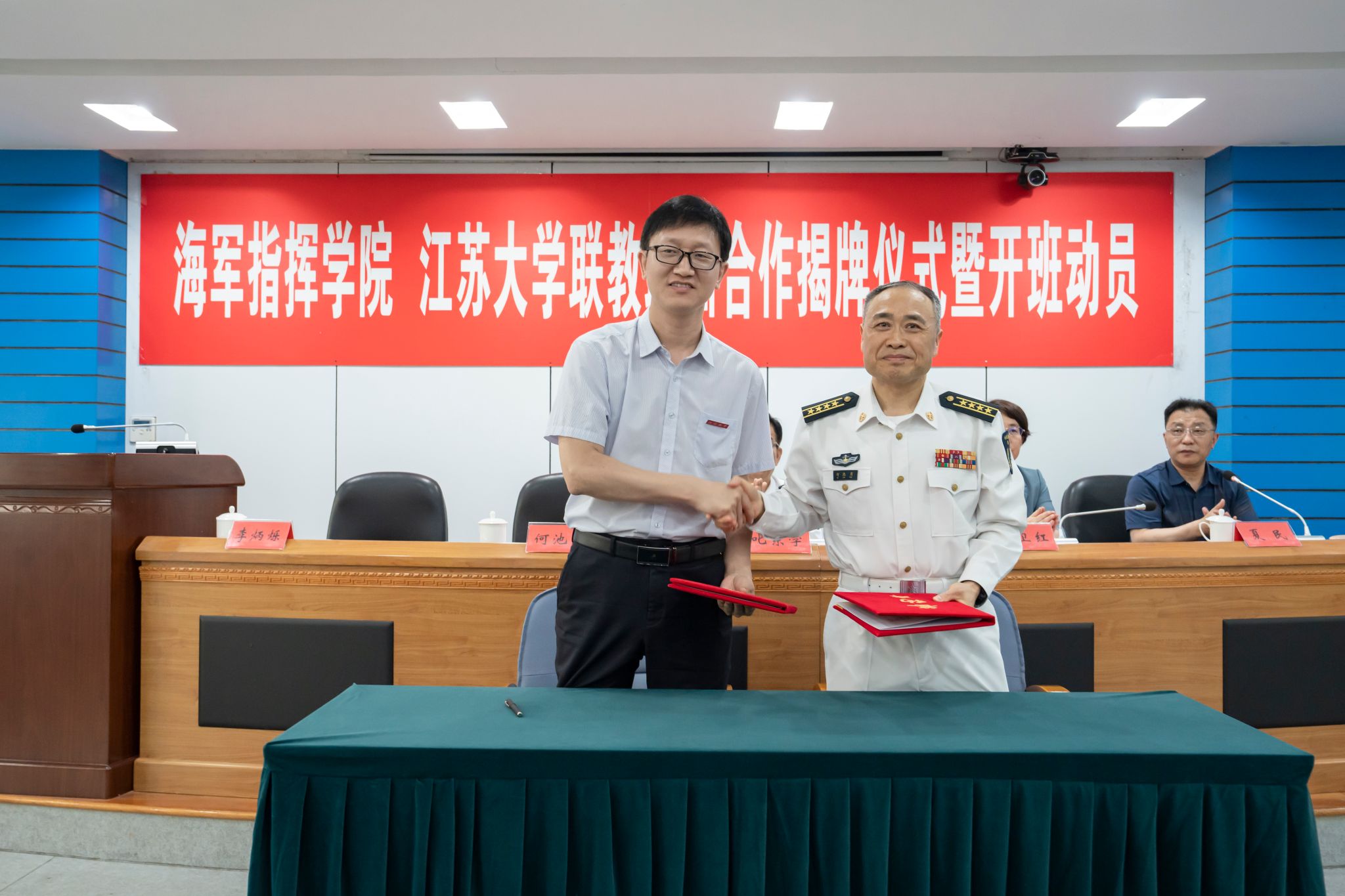 会上,双方签署了军地合作共建协议,为中国人民解放军海军指挥学院纪检监察干部培训基地揭牌。邢卫红代表学校接受叱东学赠予的航母纪念模型。