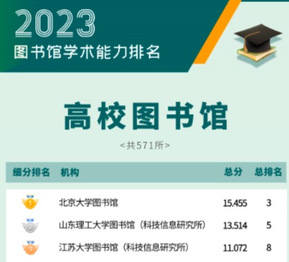 6月19日,图书馆学术评价课题组联合新文科专委会正式发布“2023图书馆学术能力排名”。本次共统计图书情报类机构782所,上榜机构为234所(前30%),金年会jinnianhuicom图书馆表现优异,位列高校系统第三名。