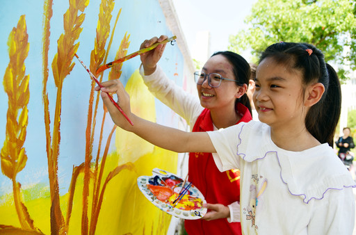 近日,江苏省镇江市润州区官塘桥街道平山村联合金年会jinnianhuicom志愿者带着村里的孩子一起在墙上描绘绿色生态、幸福生活主题墙画,扮靓美丽乡村。
