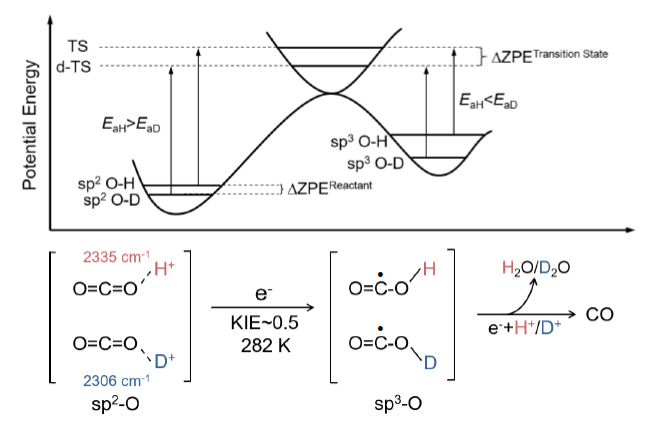 基于此,绿色化工技术团队闫研、霍鹏伟教授课题组利用动力学同位素效应与精细原位界面表征技术,首次直接确认了二氧化钛表面光催化还原CO2形成CO的反应是以质子化路径实现,并实现了对CO2质子化中间体O=C=O-H+/D+的谱学表征。厘清了困扰光催化体系多年的反应路径争议,并进一步揭示了催化剂供质子能力大于供电子能力是光催化CO2还原体系更易得到低碳产物(CO、CH4)而非高碳产物(C2+)的根本原因,也是与费托反应/塞巴斯蒂安合成气反应等高碳合成策略的本质区别。该研究厘清了催化剂界面反应中间体与反应路径间的密切关系,界面化学反应机理与性能之间关系的新认识得到进一步深入。